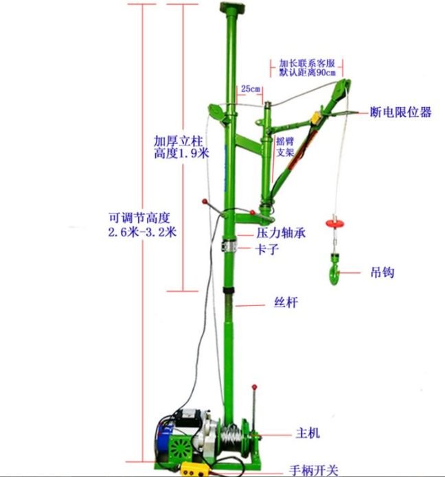 單立柱吊運機的優點是上頂天下頂地,安裝簡單,不用打孔,吊臂可360度旋轉,支撐桿高度可以調節,電機帶離合可快速下放,一秒到底,可在室內、樓道、陽臺等上下距離不太高的場合吊裝沙子、水泥、門窗、護欄等,簡單好用,攜帶方便。